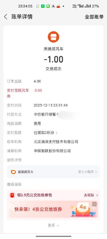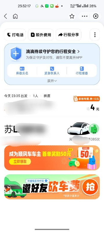 然后我用2个支付宝账户打了俩次车,用了4张优惠券(分别1张平台券和1张支付宝支付券)